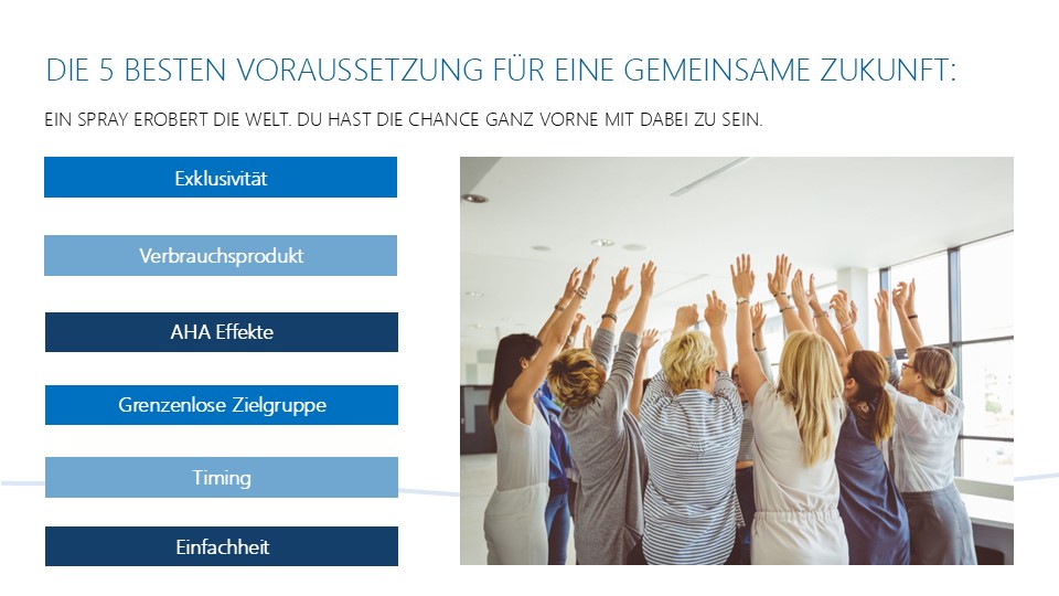 Du bist Selbständig, hast jedoch ein Unternehmen im Rücken und hast somit keine Auslagen, da du weder ein Lager mieten, noch Produkte im Vorfeld kaufen musst. Unsere Kundinnen und Kunden registrieren sich selbst, kaufen selbständig ein und du darfst dich auf das schöne konzentrieren. Die intensive Beratung und Begleitung deiner Kundinnen und Kunden. Für dies wirst du belohnt. Du ersetzt die Werbung des Unternehmens durch das Teilen deiner Begeisterung, dem Aufbau deines Netzwerkes und bildest deine neuen Partner aus. Du entwickelst dich zur Führungskraft-sofern du das möchtest. Jeder in unserem Netzwerk ist wertvoll. Ob Kunde, Partner oder Leader.