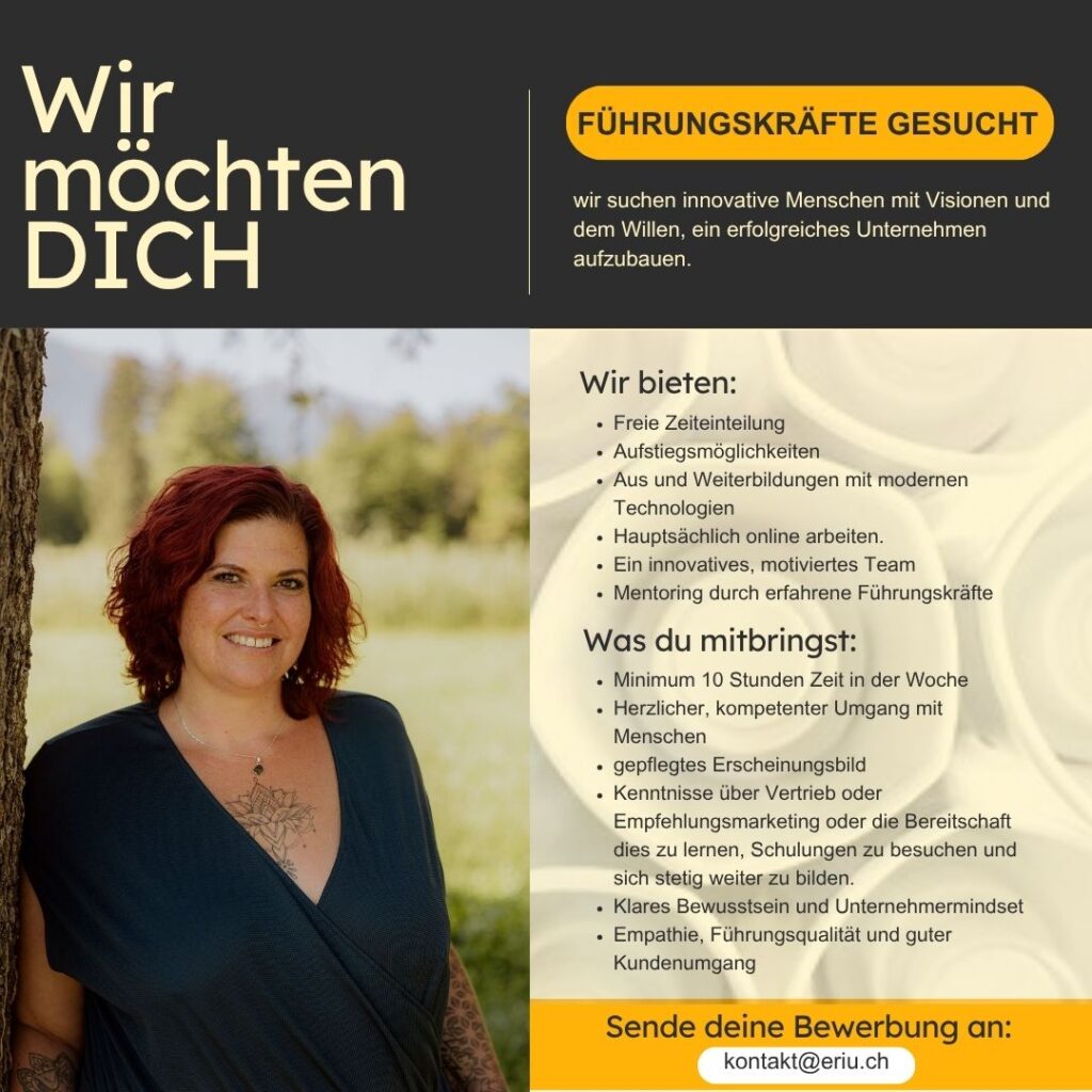 Uns ist es enorm wichtig, dass wir gemeinsam wachsen. Unser Team schreibt Humor, Leichtigkeit, Spass und Bewusstsein gross. Mir ist wichtig, dass du in unser Team passt. Hast du ein positives Mindset? Träumst du gross? Bist du mit deinem Herzen unterwegs? Achtest du Mensch, Tier und die Natur? Dann freuen wir uns darauf, dich kennen zu lernen