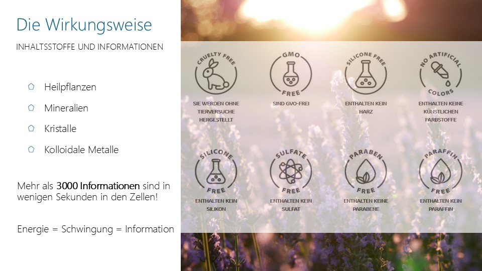 Für Sportler ebenso spannend wie für Familien. Für Tiere ebenso wertvoll wie für Pflanzen. Alle sind wir miteinander verbunden und besitzen ein Energiesystem sowie Zellen die kommunizieren. Eine ganz magische Sache- die so simpel und einfach funktioniert. Jeder, der einen Sprühkopf drücken kann, ist fähig, dieses Produkt zu verwenden.